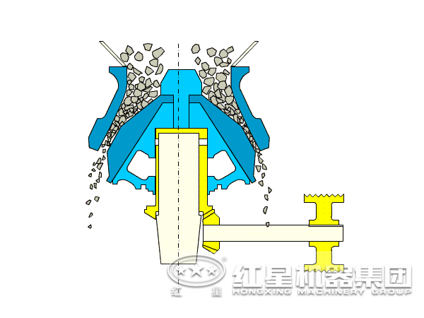 復(fù)合圓錐破碎機(jī)也是通過層壓式實(shí)現(xiàn)物料的破碎,該設(shè)備在正常作業(yè)狀態(tài)下和其他圓錐破碎機(jī)是一樣的,復(fù)合圓錐破碎機(jī)工作時(shí),電動(dòng)機(jī)啟動(dòng),偏心軸在傳動(dòng)裝置的作用下做旋擺運(yùn)動(dòng),破碎壁時(shí)而靠近時(shí)而偏離固裝在調(diào)整套上的軋白壁表面,這樣礦石會(huì)在破碎腔內(nèi)受到不斷的沖擊、擠壓及彎曲作用而實(shí)現(xiàn)礦石的破碎。